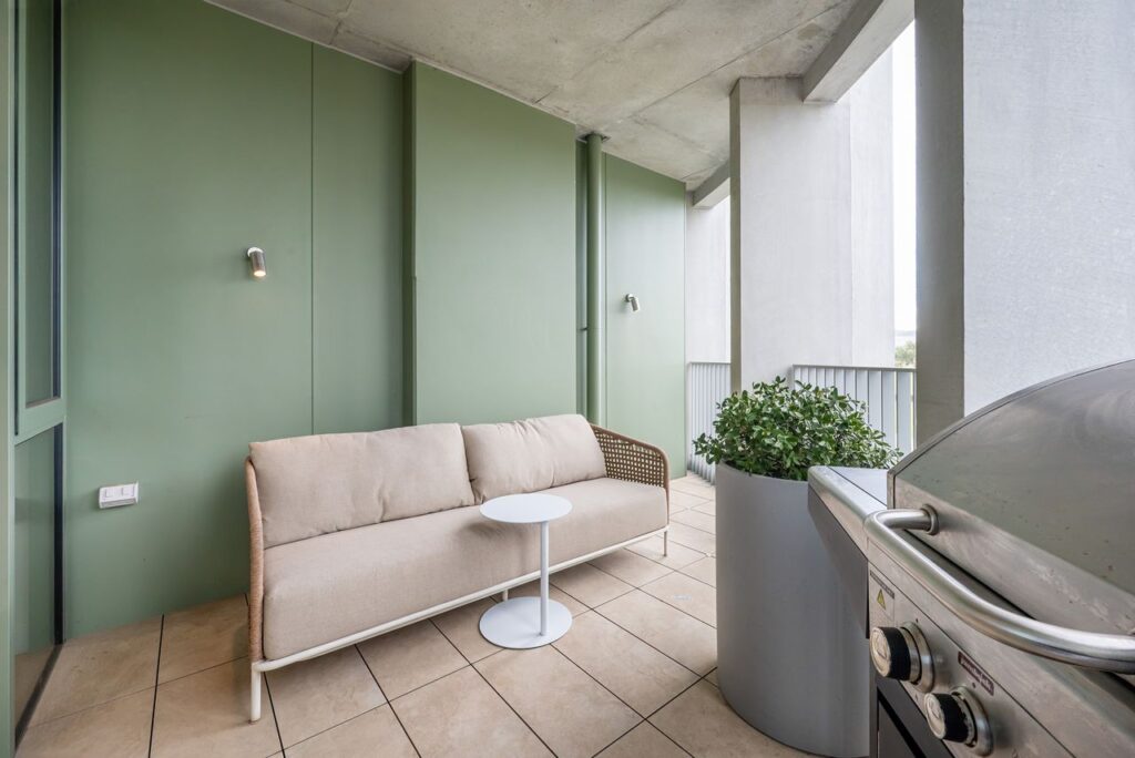The central open-plan living and dining area leads to a large balcony with outdoor seating and a BBQ, ideal for shared family meals or simply relaxing while enjoying the marina views.