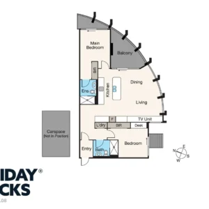 The master bedroom features a queen bed, private ensuite, and access to a tranquil garden deck — perfect for morning coffee or evening unwinding. A second ensuite double bedroom with a built-in desk provides a versatile space for remote work or extra privacy during longer stays. The expansive living and dining area flows onto a generous entertainer’s balcony with outdoor seating and a BBQ, ideal for soaking up the marina breeze and enjoying the relaxed coastal lifestyle.